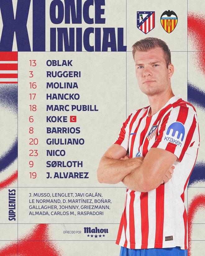 马德里竞技首发:3-鲁杰里、6-科克、8-巴勃罗-巴里奥斯、9-瑟洛特、13-奥布拉克、16-莫利纳、17-汉茨科、18-马克-普维尔、19-胡利安-阿尔瓦雷斯、20-朱利亚诺-西蒙尼、23-尼古拉斯-冈萨雷斯